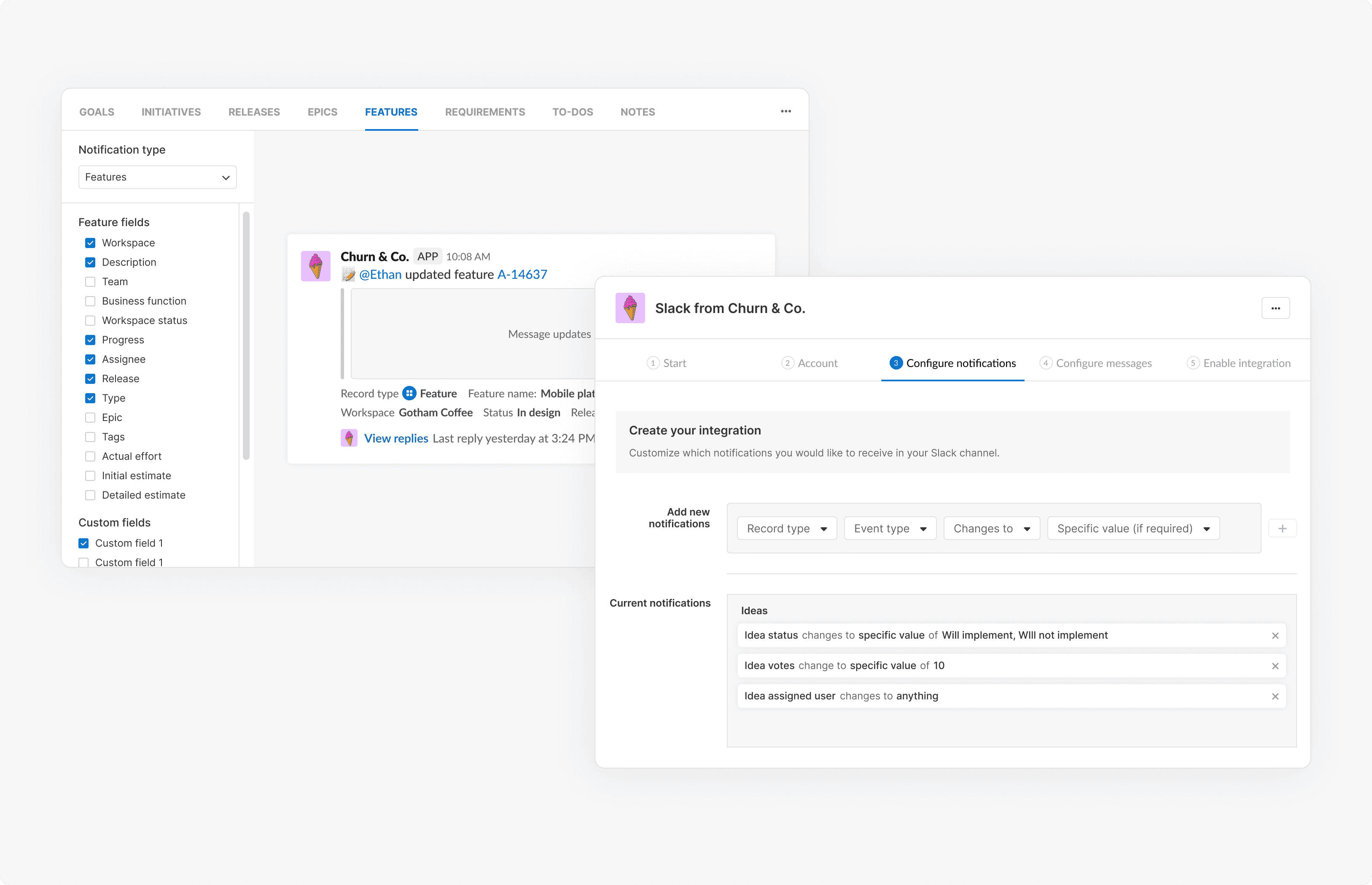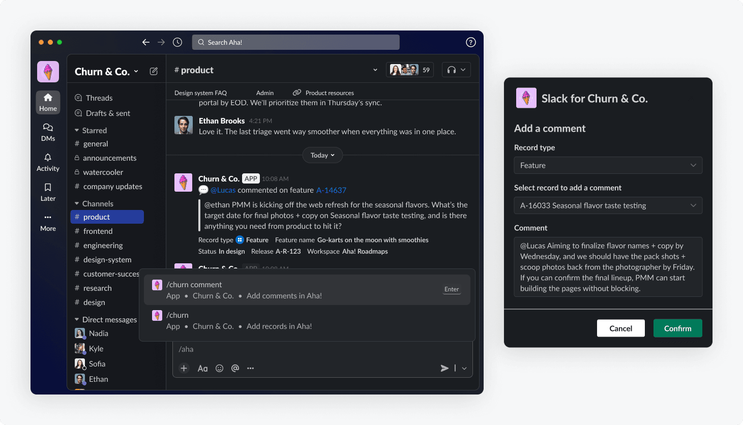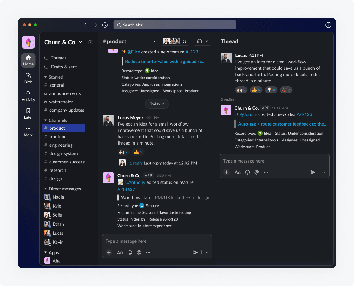 We built an integration that posts Aha! record updates and enables in-thread record creation, reducing switching and keeping teams aligned in one place.